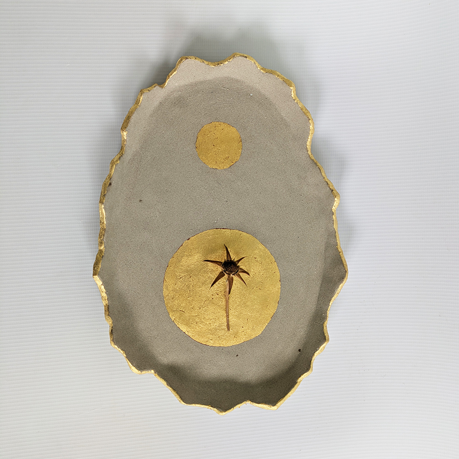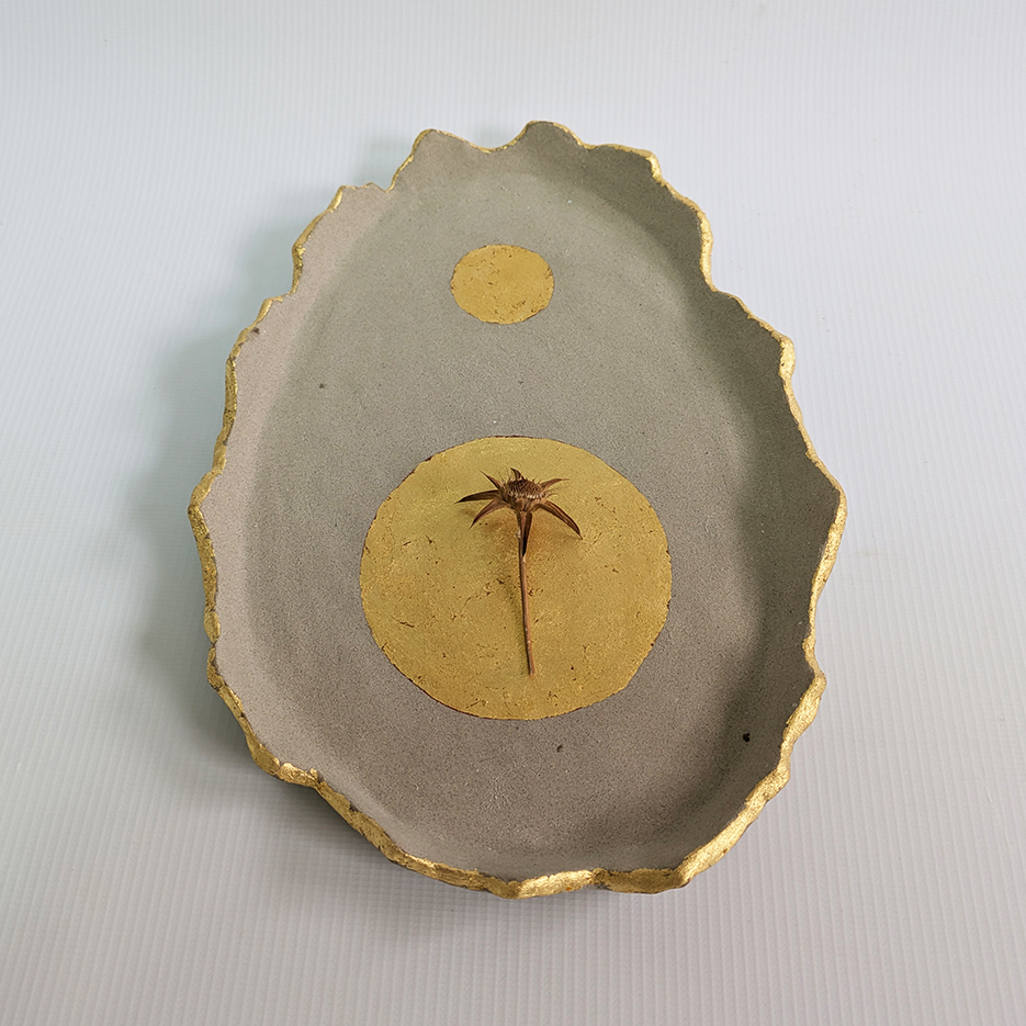 Me gusta crear estas pequeñas bandejas, cada una distinta, pensadas como diminutos contenedores de tesoros. En mi caso, suelo colocar en ellas alguna flor seca —a menudo un cardo, con sus tonos ocres y dorados— que recojo del campo donde me he criado. Pero cada persona puede depositar en ellas aquello que tenga un significado especial: un objeto pequeño, un recuerdo, un amuleto.