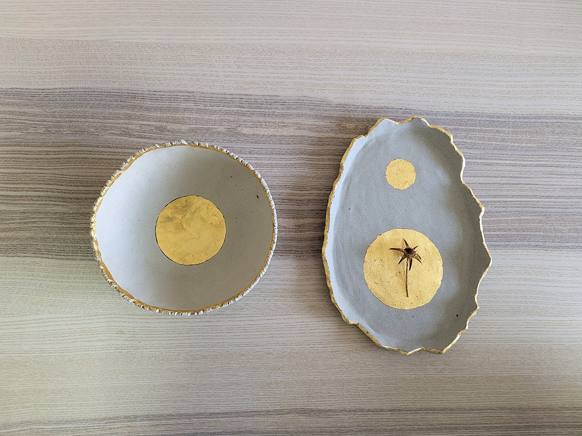 El borde, irregular y orgánico, recuerda a una cadena montañosa. Tanto ese borde como la pequeña figura central destinada a acoger ese tesoro están decorados con pan de oro, subrayando la belleza de aquello que guardamos y atesoramos.